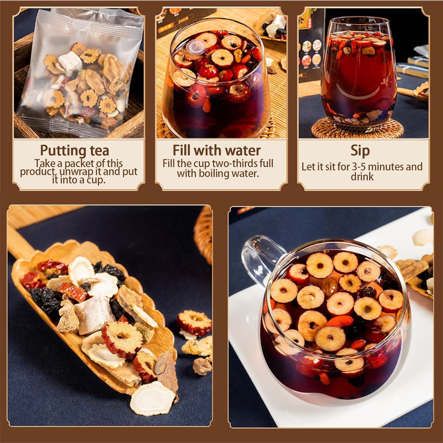 Taste: Rich and sweet. Savor it carefully and you will find the aroma of mulberry, ginseng and jujube. The tea soup is deep in color and rich in essence ingredients.