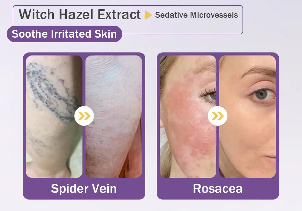 ✅ Witch Hazel Extract – Rich in natural polyphenols such as tannic acid and proanthocyanidins, it soothes microvascular inflammation, provides deep hydration, calms irritated skin, and helps reduce pain and swelling caused by venous dilation.
