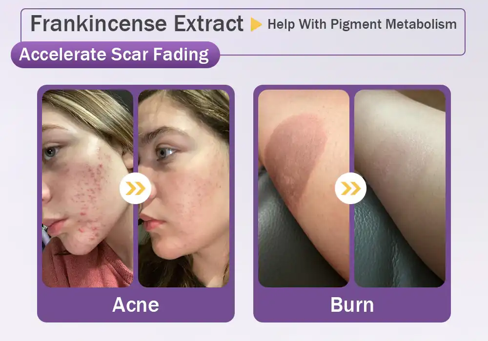 ✅ Frankincense Extract – Its active compounds, such as Boswellic Acid, possess strong antioxidant properties that inhibit abnormal skin overgrowth (like skin tags) and protect damaged tissue from free radical damage. It also aids in pigment metabolism, accelerating scar fading. Long-term use helps even out skin tone and reduces the darkening and hardening of scars.